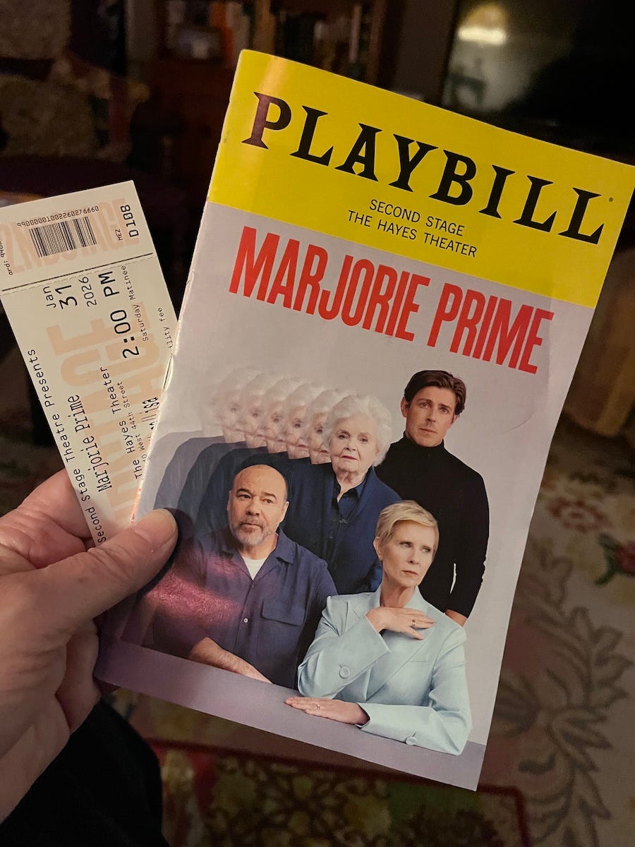 Yesterday I went to see Marjorie Prime at the Helen Hayes Theater on W. 44th St. here in New York. The play has been around since before Covid—my friend Colleen auditioned for it when it was starting a run at Playwrights Horizons, where our playwright friend Tom saw it. That’s how they remember it—an event before Covid. The play itself, by Jordan Harrison, concerns an 85-year-old woman (born in 1977, so we’re about forty years into the future) in the late beginnings of dementia, cared for by an unseen woman named Julia, and visited periodically by her daughter and son-in-law. At the opening, an oddly stiff, handsome young man (Christopher Lowell) is talking with Marjorie (96-year-old June Squibb, who is just remarkable; I first became aware of Squibb in the movie About Schmidt, where she played a Midwestern wife to Jack Nicholson’s Schmidt and was so good I thought they’d plucked an Iowa housewife off the street for the brief but pivotal part. Sidebar: I know he was nominated for an Oscar, but I thought Nicholson was all wrong for the part—it’s one that really belonged to a less complicated actor like Paul Dooley. I digress—and yet remembering our takes on things is also part of what I’m focused on this morning.)
