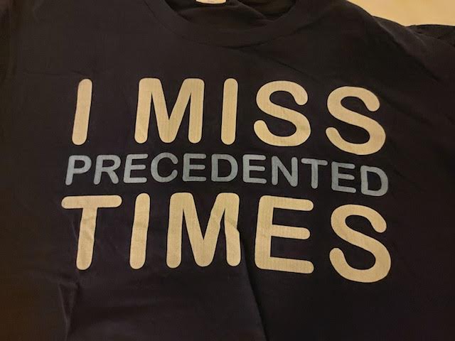 When we ask for “precedented times” (see tee shirt picture), we are asking for a level of comfort and predictability that any sentient person would desire. Sure, it’s too much to expect, but in the words of Mary Chapin Carpenter, it’s not too much to ask.