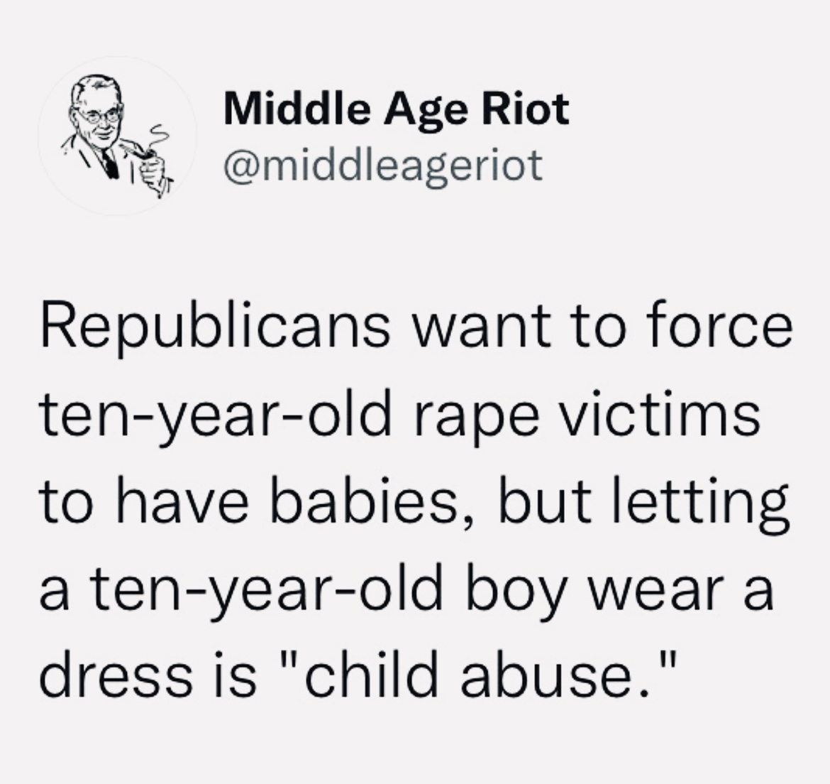 Here it is: It’s 2022 and a 10-year-old rape victim in the Midwest cannot legally obtain an abortion since the overturning of Roe v. Wade. And child marriage is back on the table. Child labor, too. See also, the other extreme: The forcing of the aged back to work and the ending of retirement thanks to “Sen.” Rick Scott (R-FL).