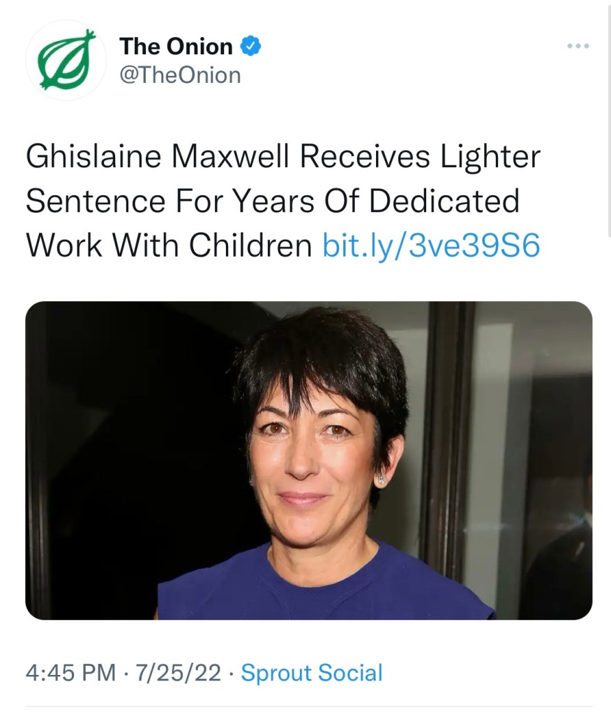Meanwhile, Ghislaine Maxwell, a convicted sex trafficker, is moved to a cushy minimum-security prison with yoga. Because otherwise I guess she releases the names of all those powerful white, male johns.