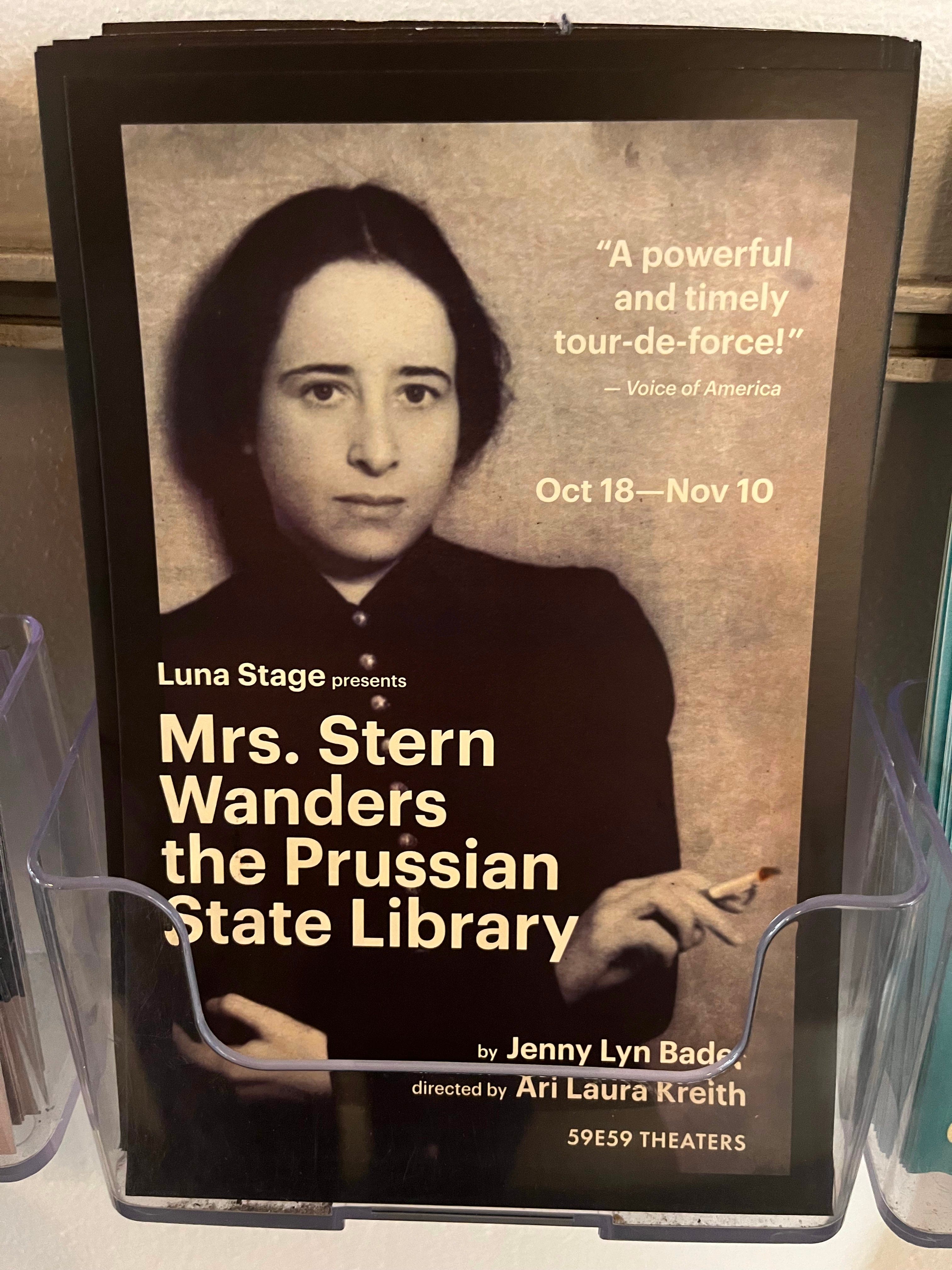 I’ve been imagining during my sleepless nights the consequences of a second Trump presidency—I cannot see how we are really here, but then no one imagined a Trump to begin with, so showered with love and celebrity coverage by a besotted press. Last night I went to see a play at 59E59 Theater here in New York called Mrs. Stern Wanders the Prussian State Library by Jenny Lyn Bader. The subject of the play is the period of days a young Hannah Arendt was imprisoned and interrogated by a Nazi officer (whom she ultimately convinces to help her) in Germany in 1933. The investigating Nazi officer in the early days of Hitler’s Chancellorship and martial law is convinced that Mrs. Stern, rather than working on her dissertation, is mimeographing and distributing overseas the antisemitic writings and cartoons in the German papers. Because of who she is, we know that Arendt gets out, since she will famously go on to cover the Nuremberg Trials, there to develop a philosophy around the nature of evil and the ordinary people who become complicit.