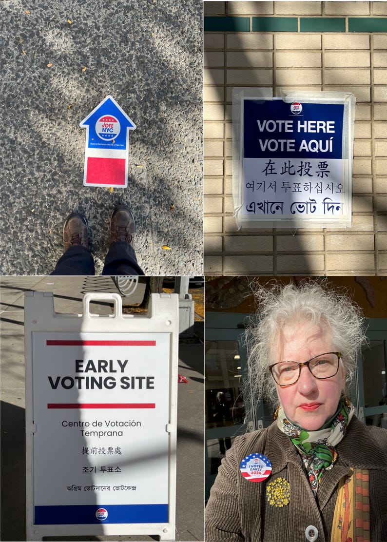 Today I “early voted” here in Queens, surprised by the lack of turnout, in some ways, but this being New York, local Democrats don’t have a lot of competition. (Still, I live in an area full of Trump voters, particularly Hispanics, too many of whom more or less worship the man (if tee shirts are evidence) who plans to deport them within days of returning to office, citizens or not, it won’t matter.) The poll workers gave me such heart, though, just to see them there, all caring so much about democracy.