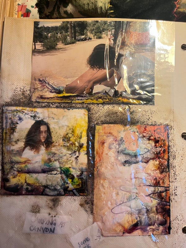 And in 2003, when I moved from Virginia to New York City, I accidentally took my box of curated collage-photo albums to my sister’s basement (instead of my parents’ house) to store, where she had a one-time-only flood that miraculously only destroyed that one cross-country trip album. (D, a practicing witch, said when I told her, “You’re welcome.”) Moldy and blurred to oblivion though it was, I didn’t have the heart to get rid of that album, but upon seeing the horror, D convinced me last week to do that—I snapped a few pages for memory first, and indeed, tossed the hunk of mildew and mold into a plastic bag and out to the trash.