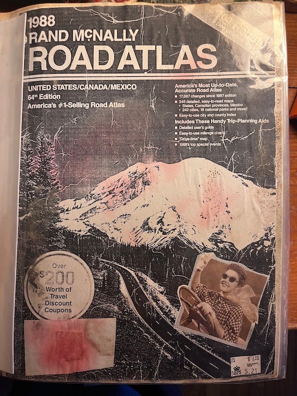 Last week an old college friend, D, came to visit with one of her grown daughters, whom I hadn’t seen since she was a toddler. Back in 1988, my friend accompanied me on a cross-country odyssey, back when you used paper maps and had no cell phones (and the sign on leaving Barstow, CA, for AZ said, “NOTHING FOR 150 MILES” and you drove onward); the entire month-long trip cost us $200, including 89¢/gallon gas for a Toyota truck that got 35 miles to the gallon; and $2.00/night camp grounds when we weren’t in the beds in the houses of relatives. Food was cheap—a full chicken dinner might be $4.95, and we could split it. On return, I made an album, photocopying the road atlas cover, the tapes, cutting out ad tag lines, headlines, and images from the local newspaper or magazines to comment on the photos.