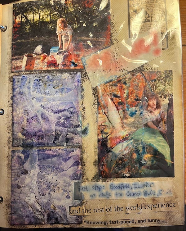 And in 2003, when I moved from Virginia to New York City, I accidentally took my box of curated collage-photo albums to my sister’s basement (instead of my parents’ house) to store, where she had a one-time-only flood that miraculously only destroyed that one cross-country trip album. (D, a practicing witch, said when I told her, “You’re welcome.”) Moldy and blurred to oblivion though it was, I didn’t have the heart to get rid of that album, but upon seeing the horror, D convinced me last week to do that—I snapped a few pages for memory first, and indeed, tossed the hunk of mildew and mold into a plastic bag and out to the trash.
