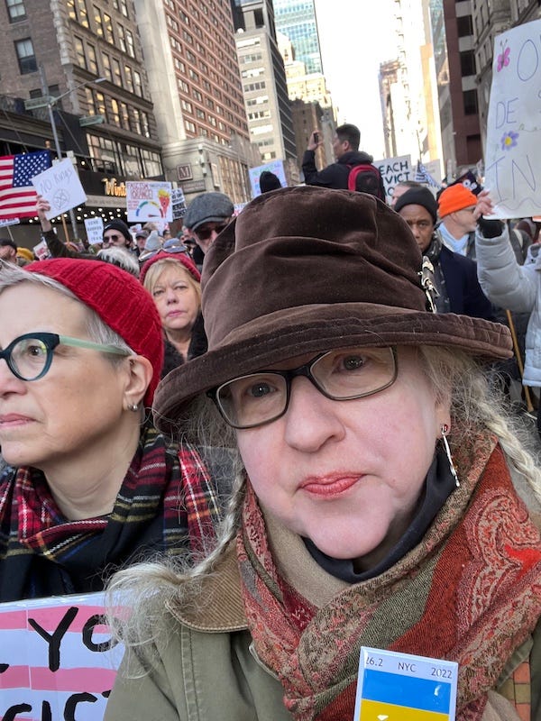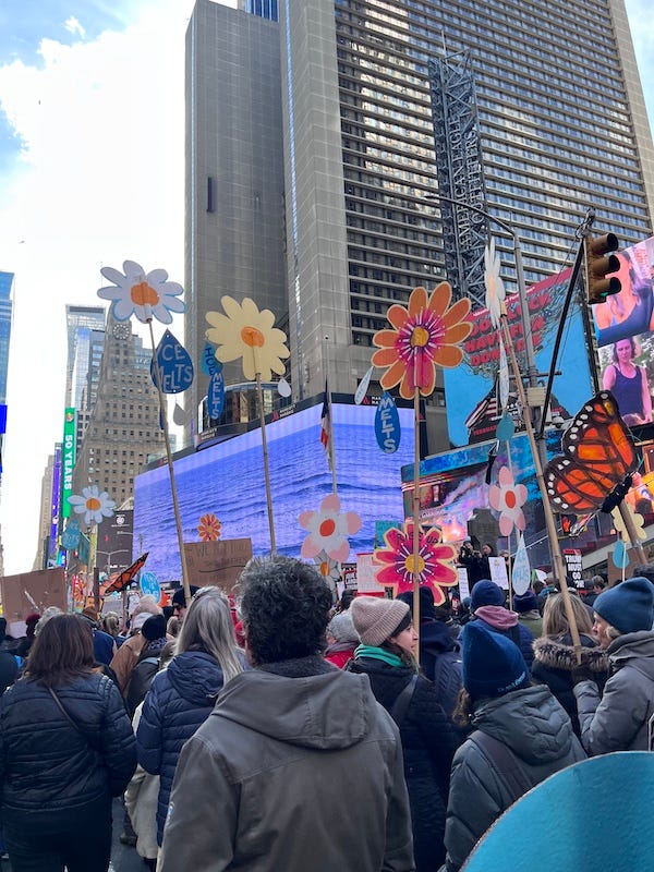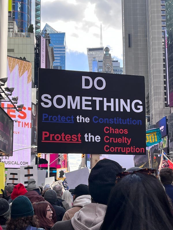 Last Saturday, March 28, around 2 PM, I made my way to Columbus Circle via the 7 and 1 Trains, avoiding barricades by walking along the sidewalk to 7th Avenue, where I easily slipped into the No Kings 3 March in New York City. I did the first march to Madison Square Park back in October, but missed No Kings 2 in January due to illness—but it’s when you see a woman with one leg use sticks to walk the full length of No Kings 3 that I feel embarrassed to have let a little flu and a sprained toe stop me last time.