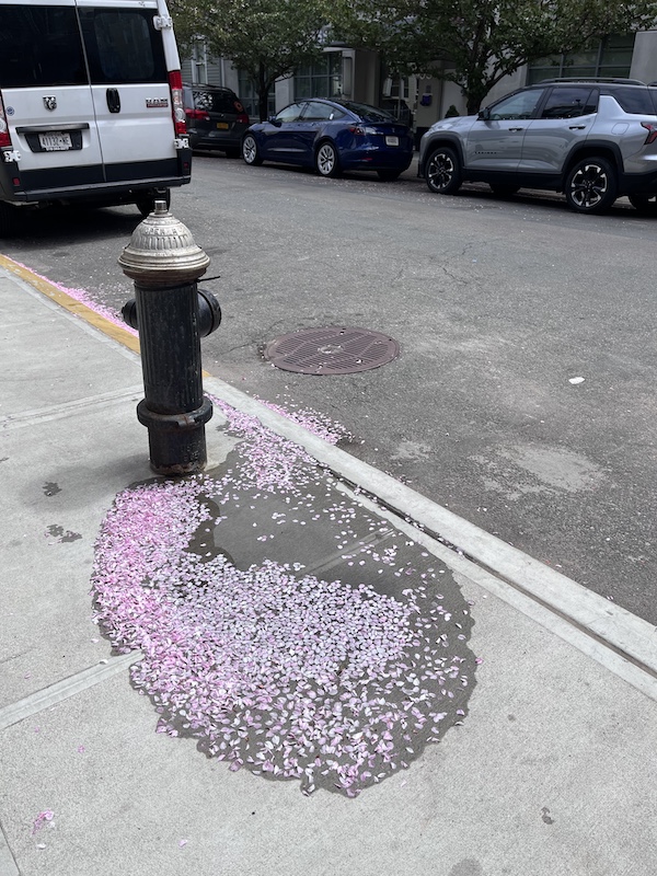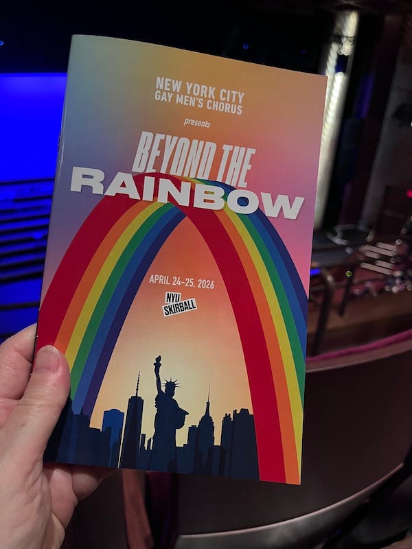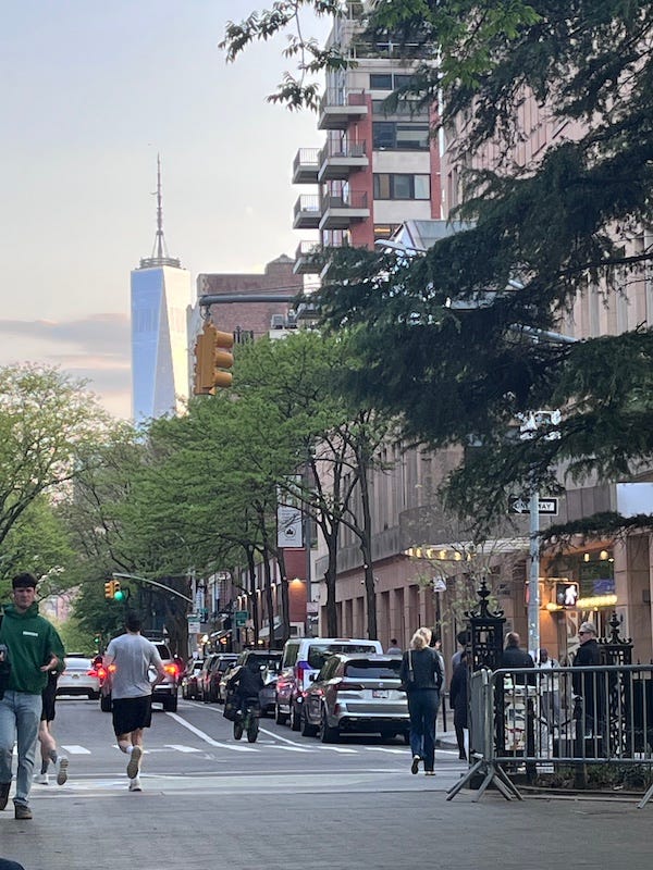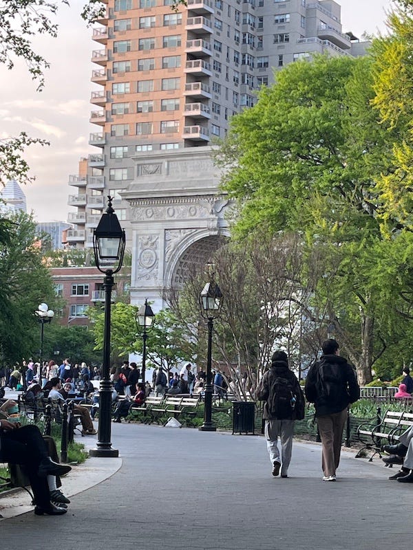 Outside at Union Square, I walked University Place toward Washington Square Park, heading to the Skirball Center to hear the New York City Gay Men’s Chorus, in its 45th year—one charter member still singing!—and gave myself time to wander Greenwich Village as dusk rolled in, the best time. In my walks I make a point of making eye contact, smiling—not idiotically, but because it’s a nice thing to do. It’s spring, be here, have this experience. The park is nice.