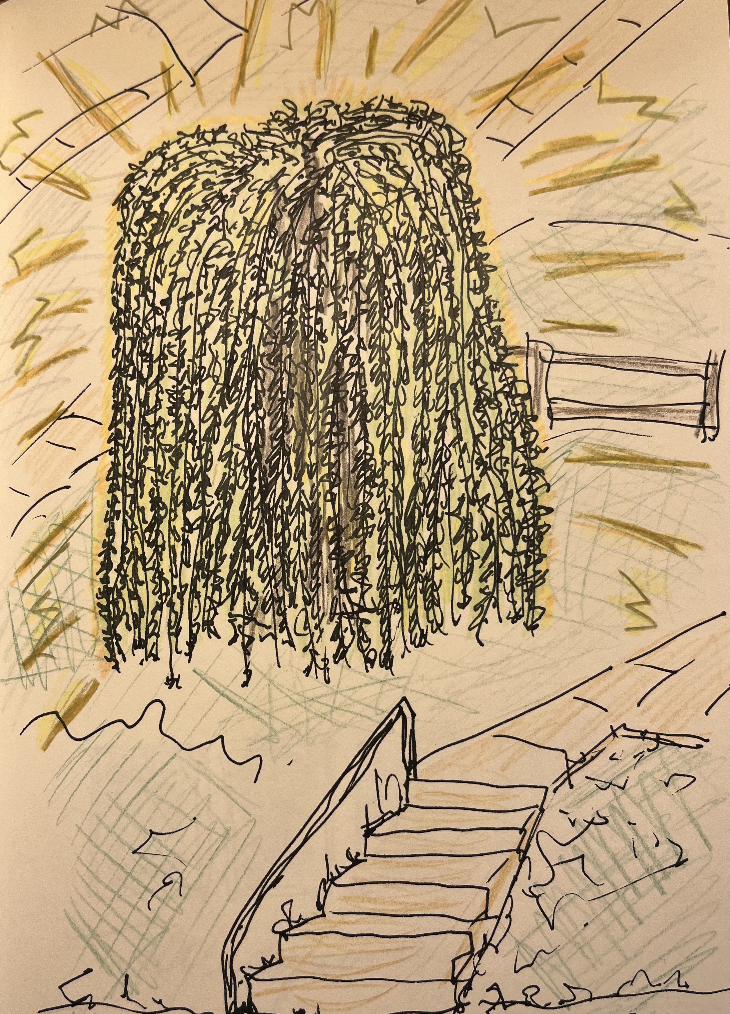 I lived in the country for the first twenty years of my adult life, and I have country trees I could talk about, but events of the week got me thinking about two particular trees—of my childhood and now—so much so that I had to try to draw them. I thought I’d tell you about them, though I’m not sure why I need to do this. Let me know if you figure it out.