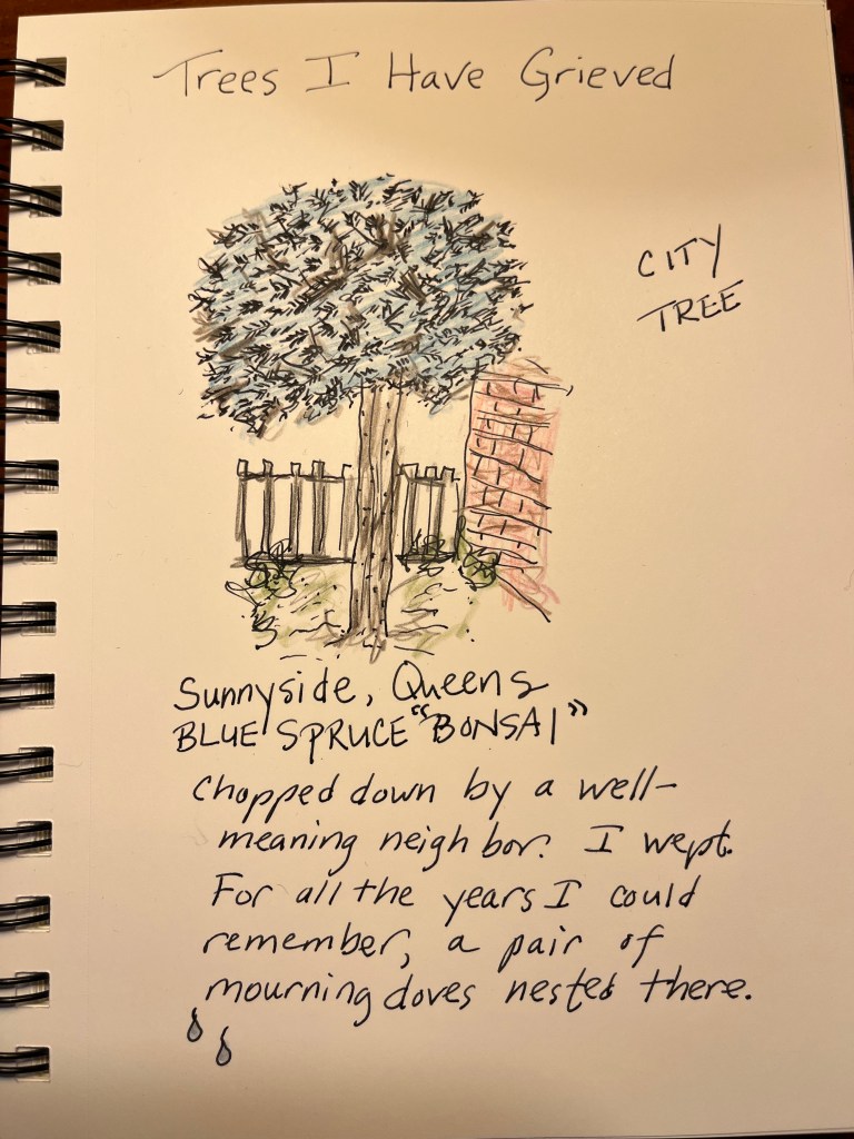 In my co-op apartment building in Queens, to take one example, the board has long neglected one side of the complex, the side I enter on, because no one else really sees it, as they enter on another street. A giant mulberry tree (that no one missed) had to be taken out of the fenced “garden” about fifteen years ago, before it compromised the foundation, though the seedlings and shoots keep coming up out of old the roots. (The struggle is constant and will be until we can afford a landscaper to dig it up properly, but you have to admire the tenacity, you know?) But it’s this one other little oddball tree, a blue spruce, on the edge of the iron fence that meant something. With the mulberry gone, it really took off, so I had to trim it a lot to keep the prickly branches from hitting people as they walked past. I did not trim it well, but I did the best I could. It looked like a giant bonsai tree. Okay? But it was our giant bonsai.