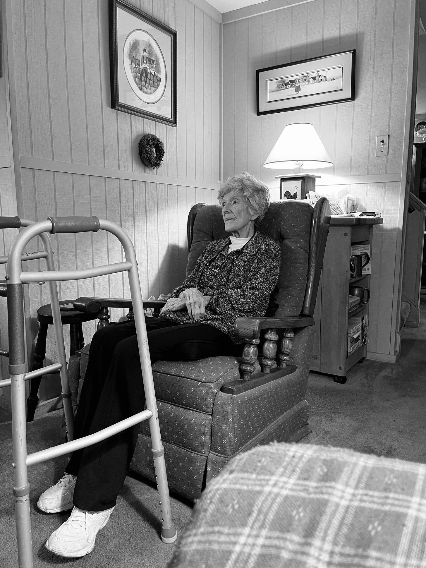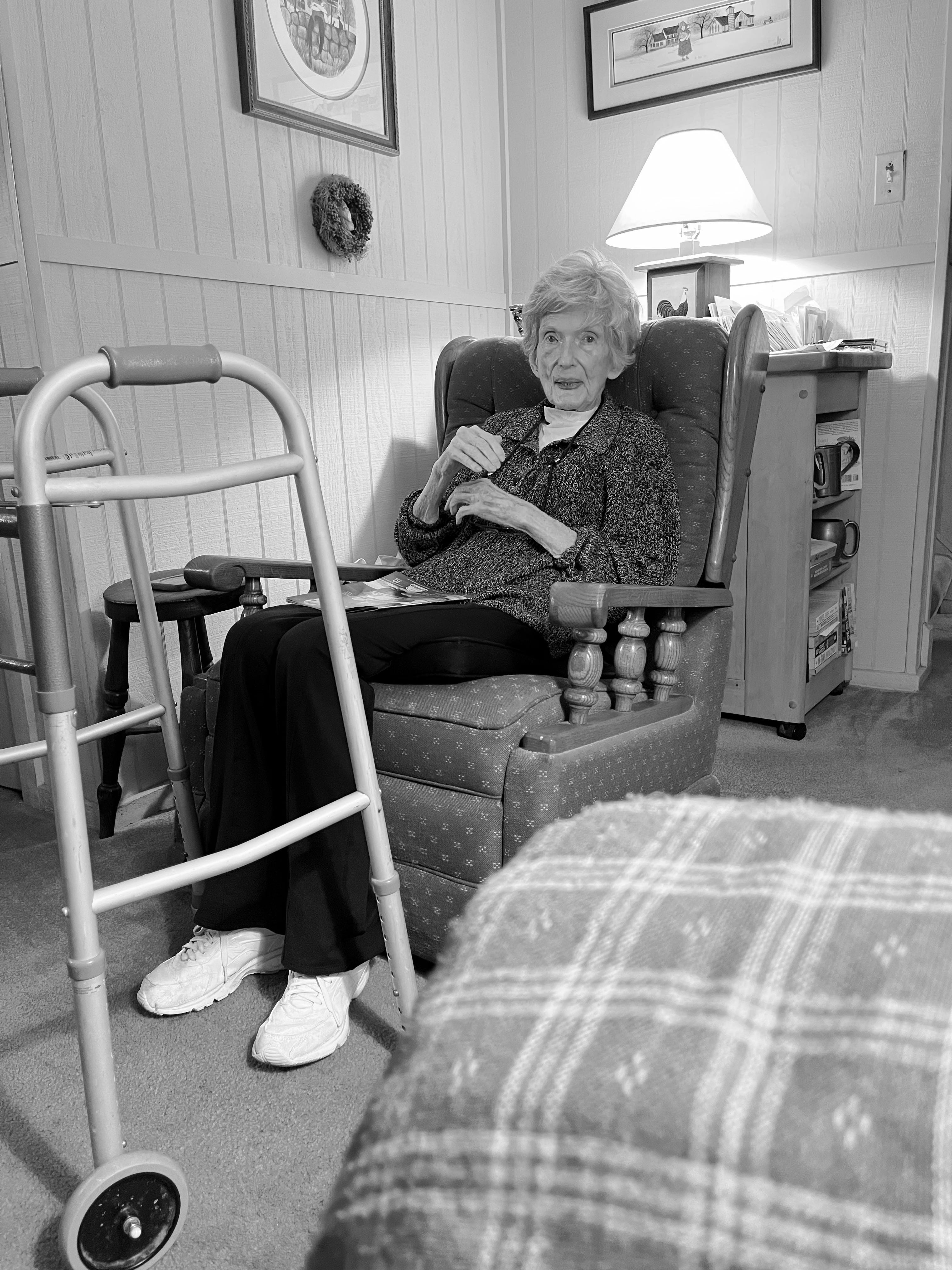 She sat in her usual living room chair.