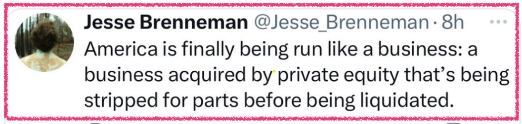 In another example, I read that some 1.7 million HOMES around the country are vacant, sitting empty since being acquired by private equity firms, either for the land or the tax write-offs, with no interest in the communities in which the houses sit. Freeing these homes to be sold to people could end the housing crisis, maybe. At this rate we’ll never know. $$$?