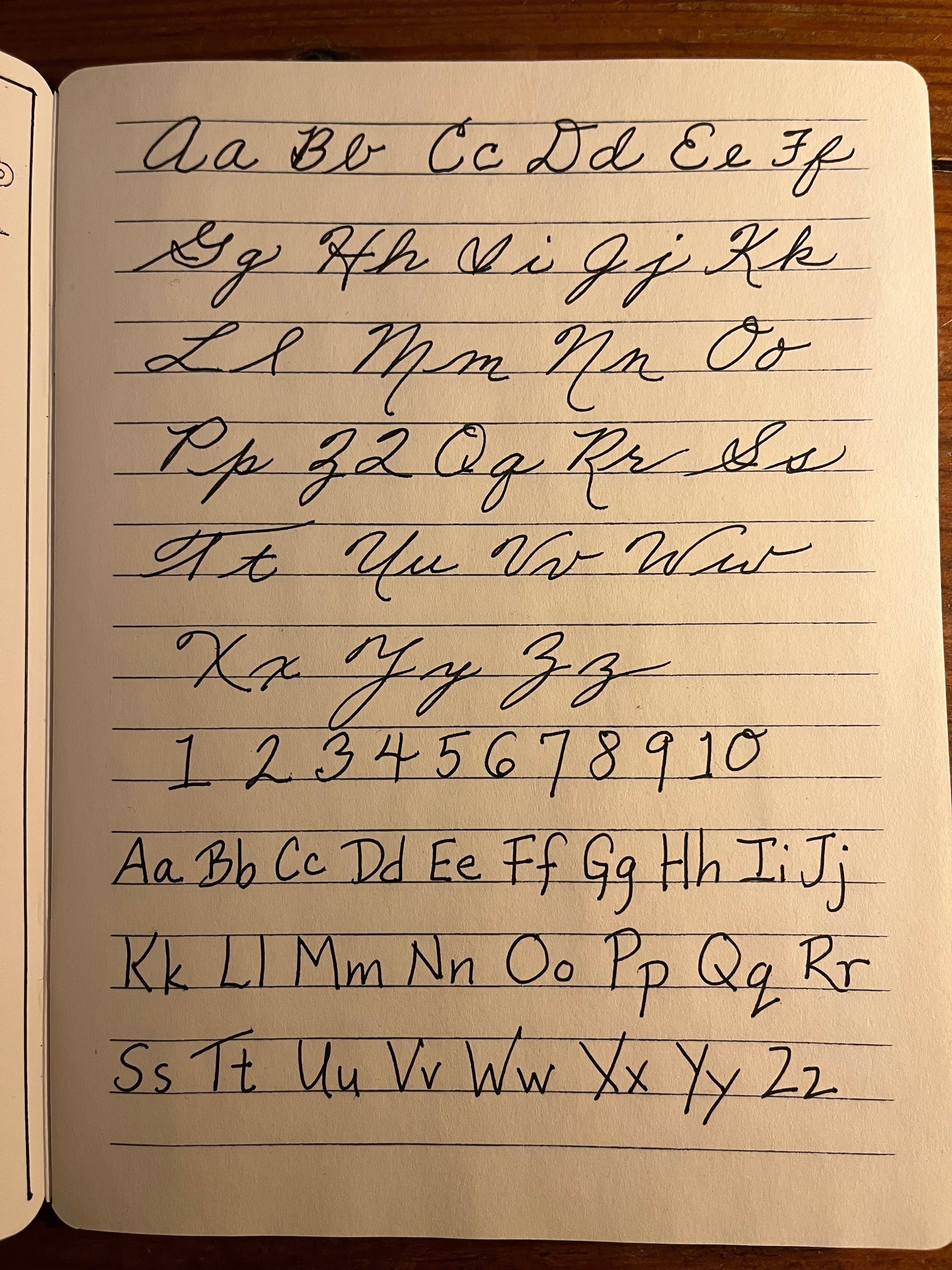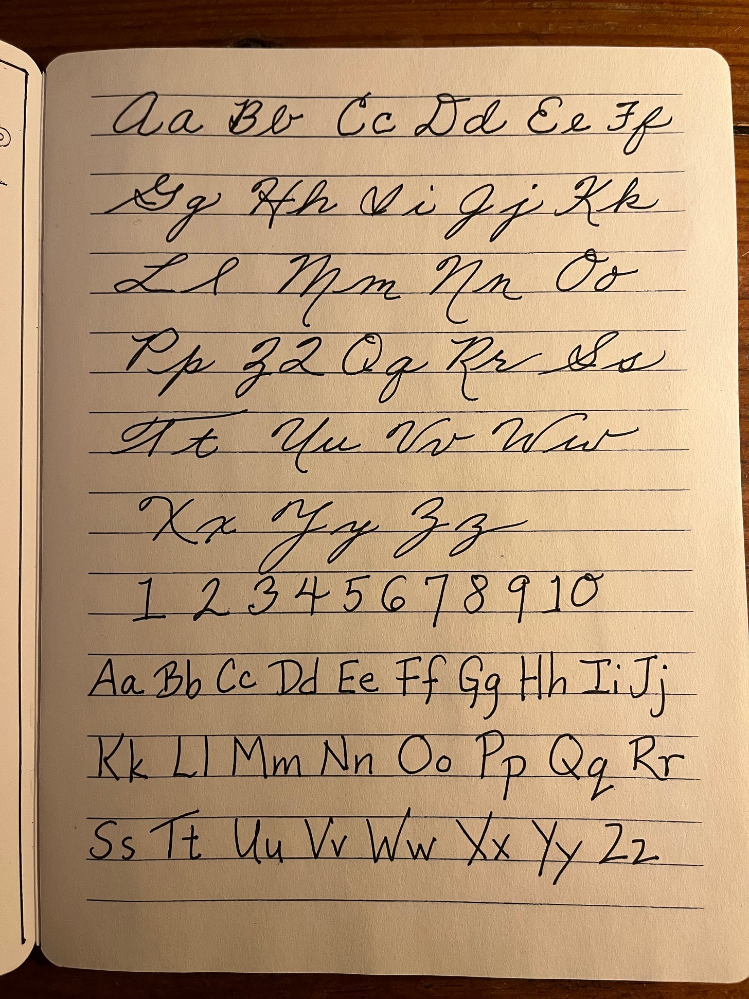 I bought this latest notebook at McNally’s on 8th Street yesterday.My first desire for this notebook, after placing impressions from all my rubber stamps on the inside cover, was to write all my letter forms and numbers. And it really got me into a sense memory of how much work it took to learn penmanship, to practice spacing, use the lines, to be able to form words to communicate. And I was impressed with my young self. I really was. Education is wonderful.