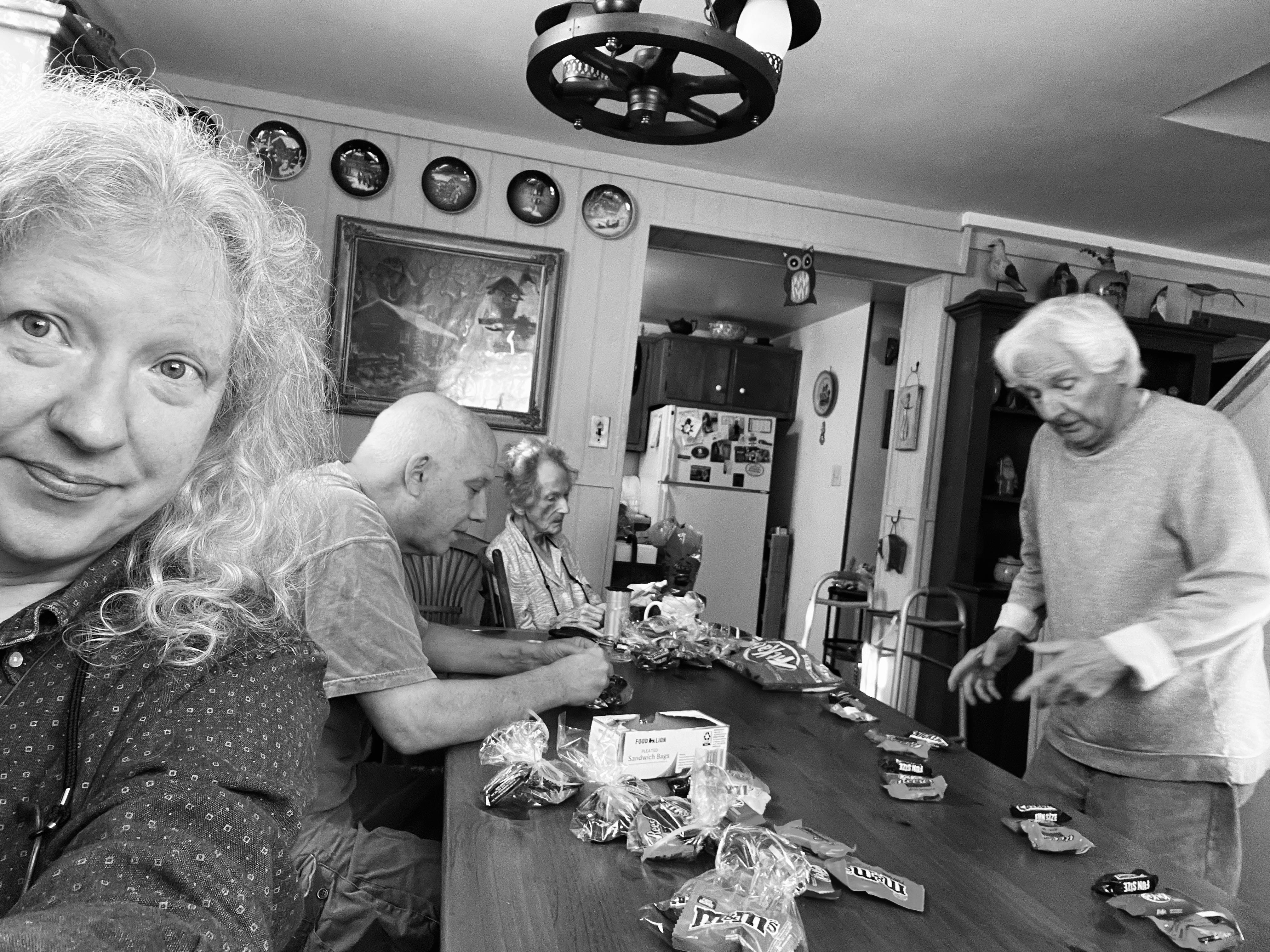 And, remarkably, we did that. (Generally, the jobs were as follows: Lynne (!) cut the lengths of ribbon, Bernie made the piles (one each of M & Ms, Snickers, KitKat, and Reece’s Cups), Jeff bagged, and Lisa tied them up. Sorry I couldn’t capture anything like fun, but we did have some nice little laughs, good memories. When sister Sherry called in the midst of this, Dad remembered Sherry and Craig (the children of my dad’s first marriage and who lived in Richmond) were in that house the first Halloween Bernie and Lynne and I lived there, in 1964, when county farmers (unbeknownst to my folks) would drop rural kids, piled into pick-up trucks, into all the new housing developments to trick-or-treat; as a result, the O’s quickly ran out of candy. Sherry (who was 7 or 8 then), who had a haul, said, “They can have some of mine,” and Dad wouldn’t let her. Sherry was born a doll. Dad said it’s the most kids they ever had for Halloween, even today.)