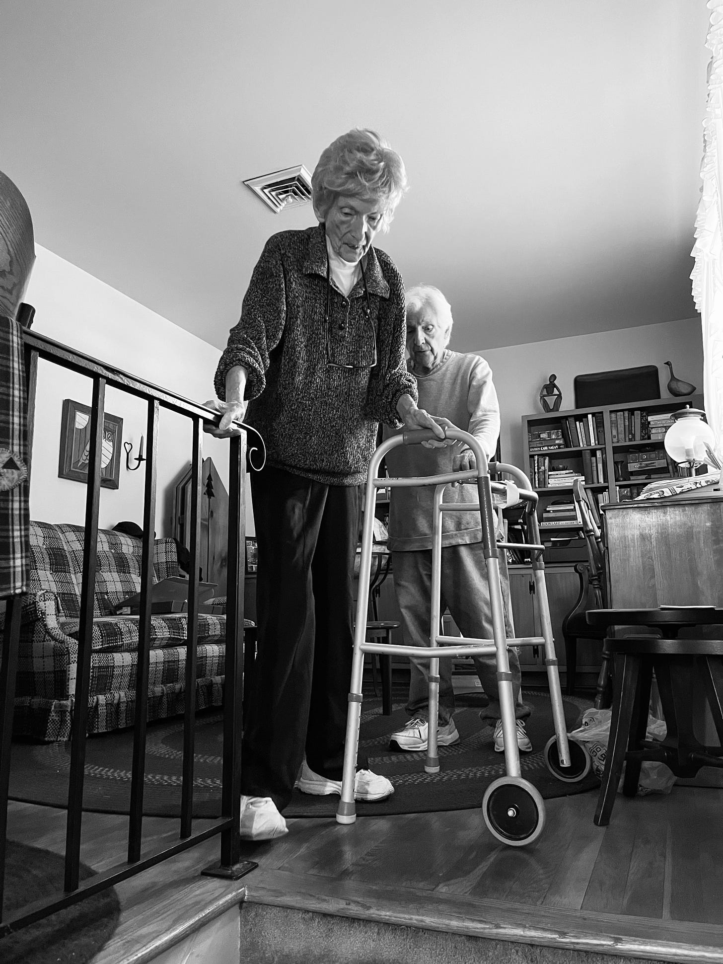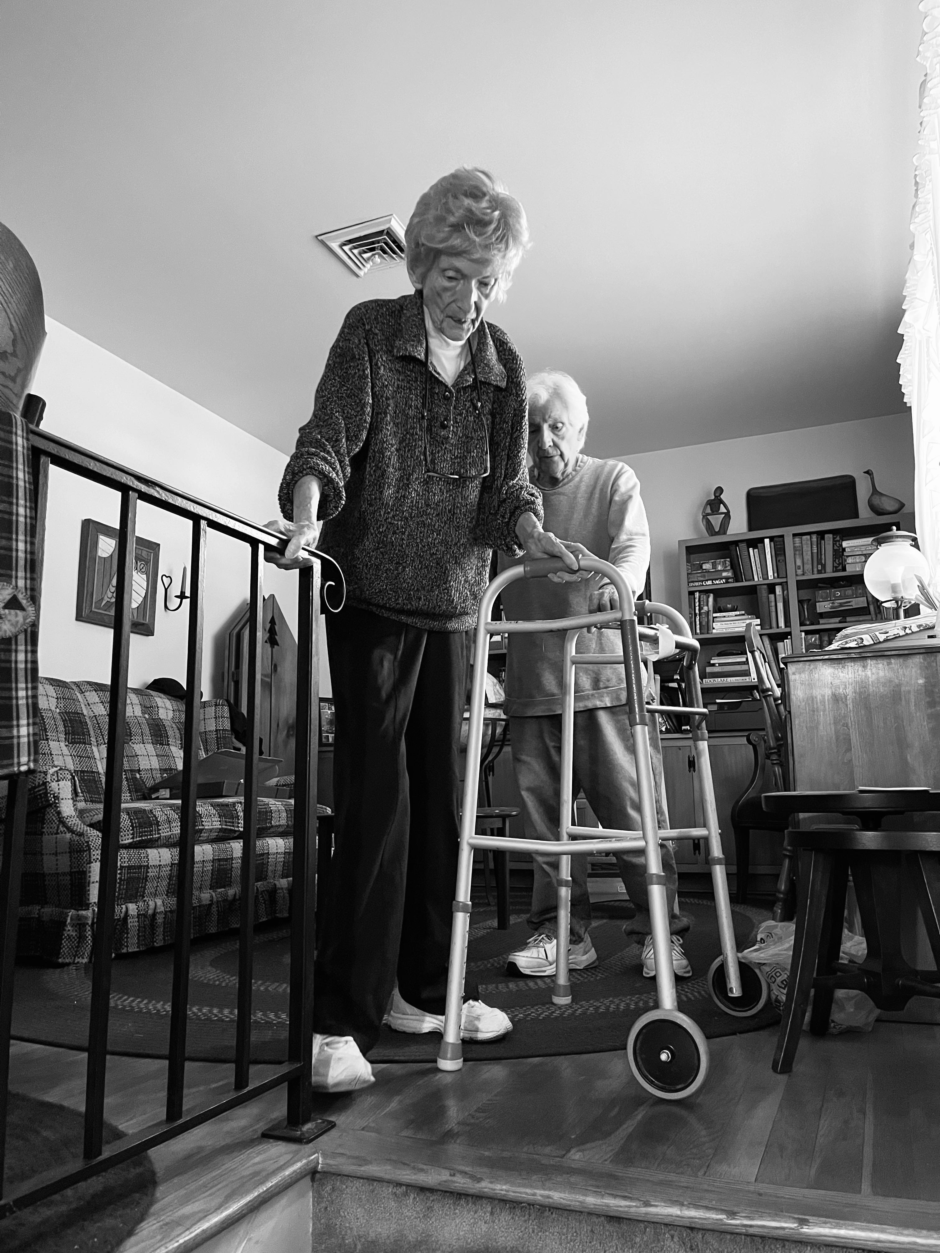 More astonishing, Lynne came back downstairs on her own, my dad bringing her walker as I watched her grab the railing with both hands, taking one step at a time, foot-foot, foot-foot.
