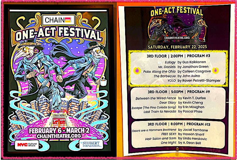 There used to be moments when, as my friend George puts it, it seems Americans are simply going to be inconvenienced to death. Now, unfortunately, and for a long foreseeable future, we are under threat of annihilation. But today, I’m heading to The Chain Theater at 312 W. 36th Street in Manhattan to see the 2 PM installment of their rolling rep One Act Play Festival, and today I don’t want to think about annihilation.