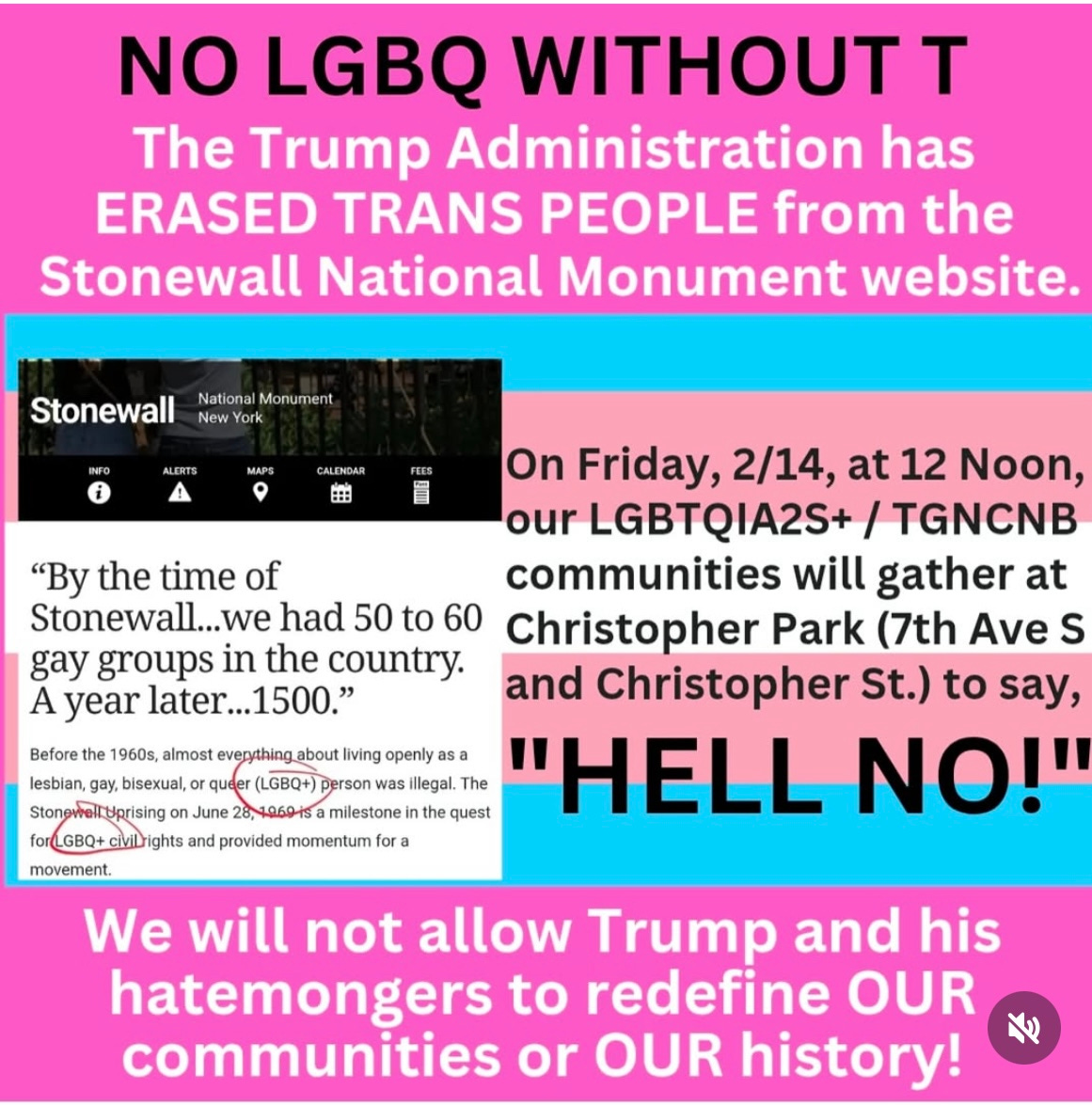 I read this on Friday morning on the Instagram account of my favorite trans performer, 2024 McArthur Fellow Justin Vivian Bond. I went to the Stonewall website several times, where they also removed the “Q,” and when I scrolled down and it said, “Was this information helpful?” I chose NO, and a box asked for tips. Oh, I gave some tips. “Where’s the T? Where’s the Q? For shame.” Times 10.