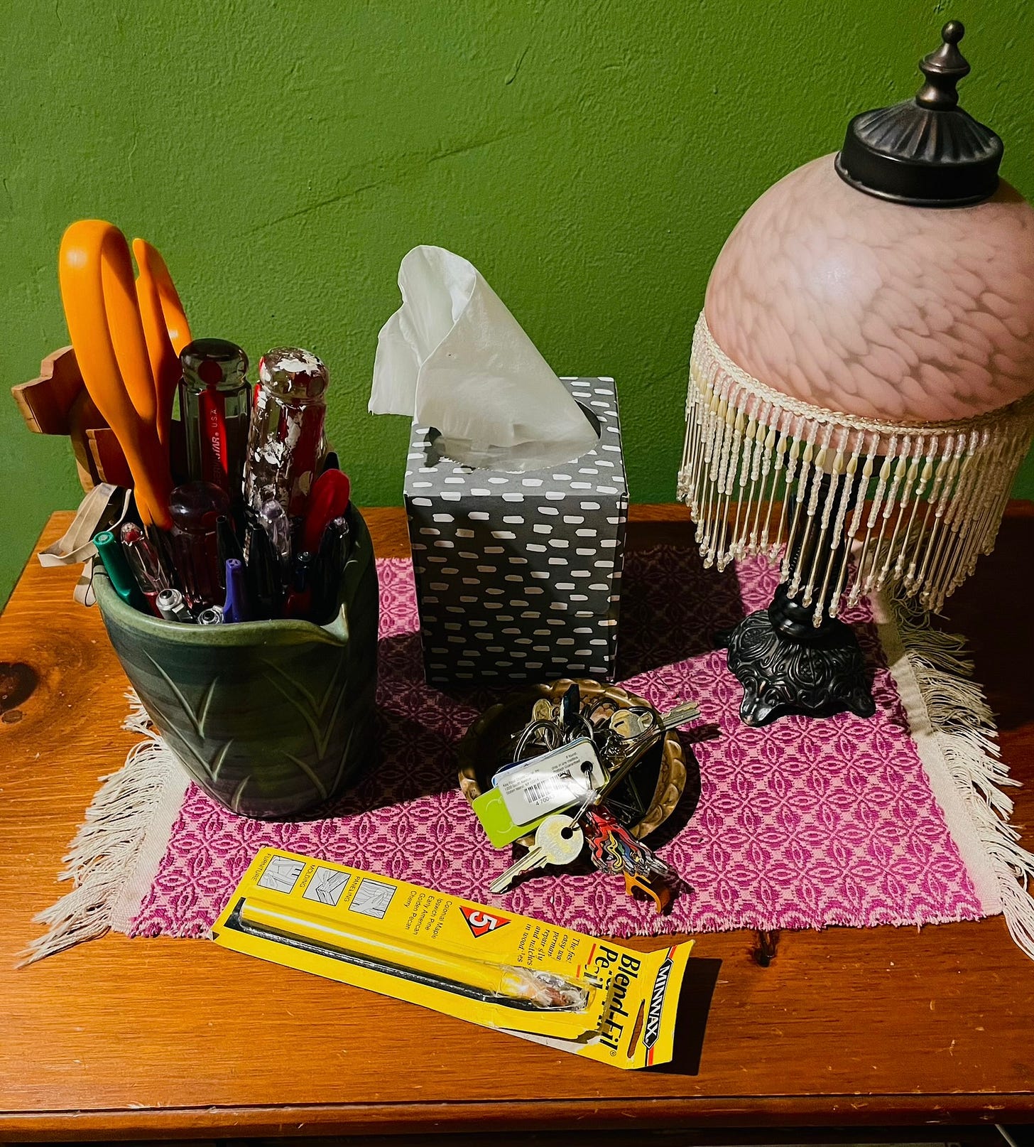As another mundane activity, before leaving for the subway with a half hour to spare once dressed (I took care to pick my ensemble and accessories, knowing no one else would actually care, but it’s my inside feeling that counts), I noticed that I have a lot of loose knobs on my two dressers. One dresser requires a Philips head and one a flathead screwdriver. I keep these in a pitcher by the door—I like to have my tools ready at hand. Knob by knob, I tightened them. In doing this I noticed a few scratches, so I went to my tool closet and found the wax wood filler pencil. And I filled the scratches, and it’s funny how the more you fix the more you see.