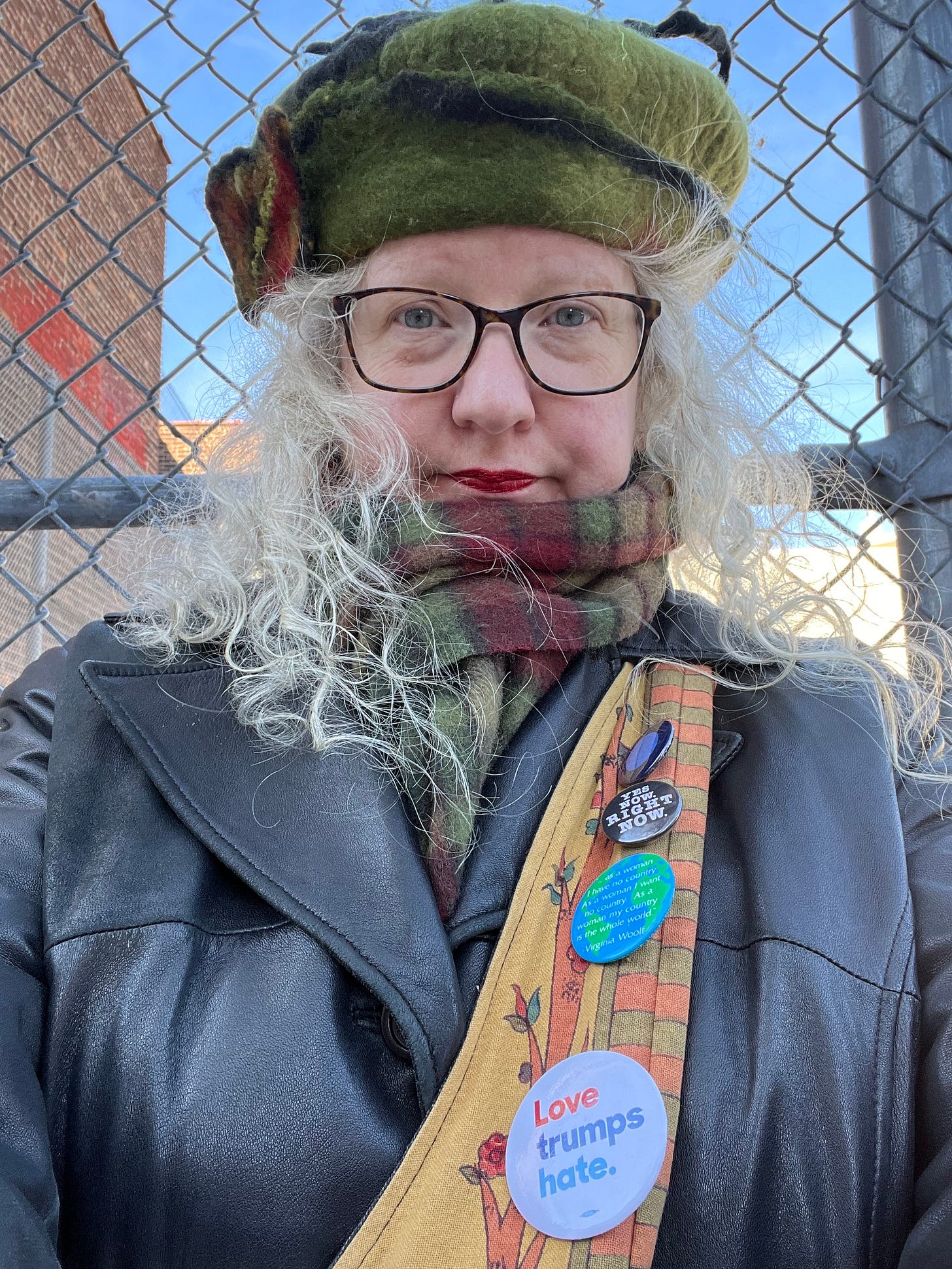 “As a woman I have no country. As a woman I want no country. As a woman, my country is the whole world.” ~ Virginia Woolf, paraphrased. Blue button and “Yes Now Right Now” button by Lisa DiPetto and available on Etsy. I had really hoped my Love trumps hate button would be a relic by now. P.S. Red lipstick was a sign of resistance against Nazis, fyi. Nous continuons.