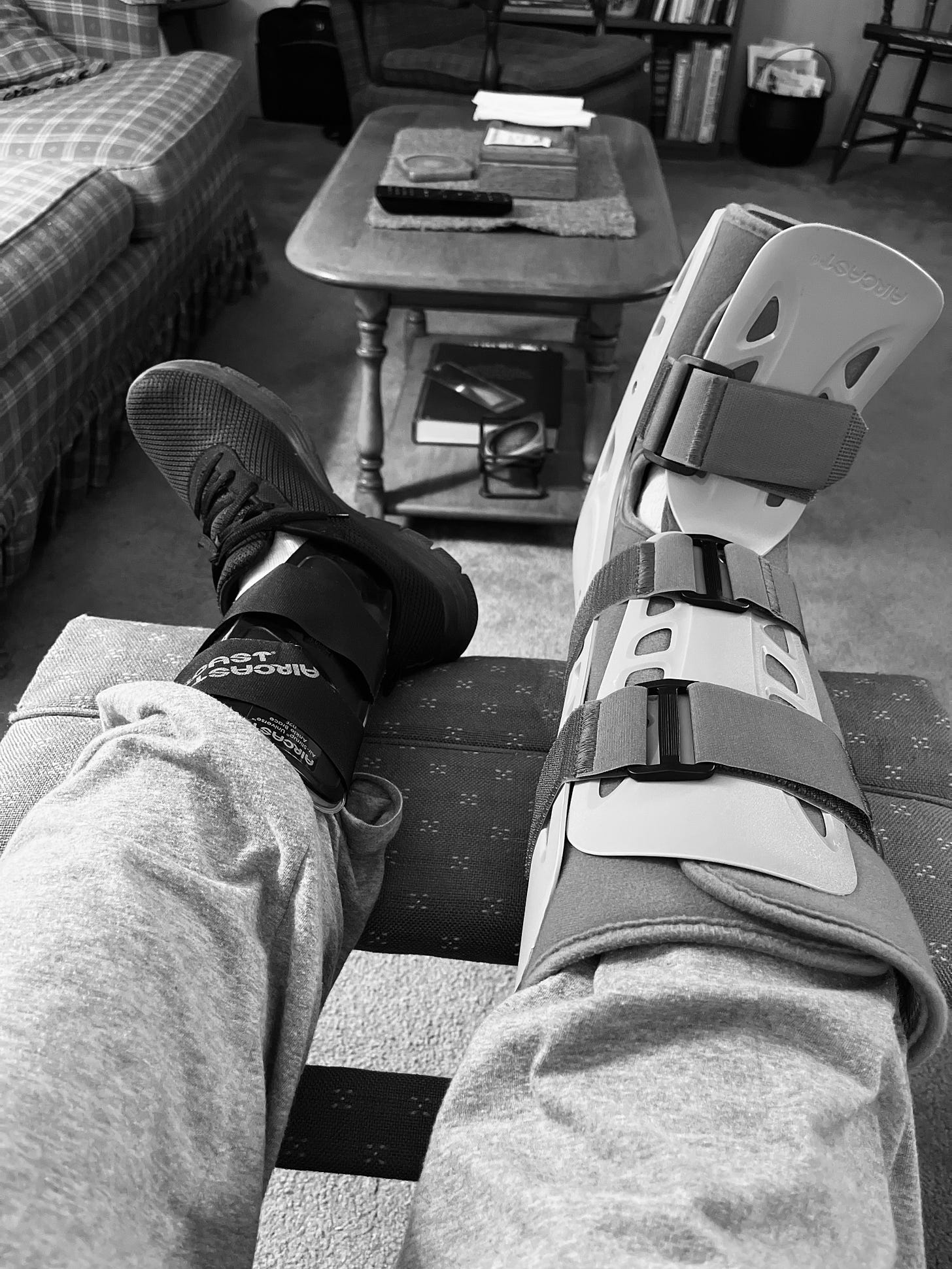 On the Wednesday before my dad’s 90th birthday, during my fifth week here, my mom moving around a little better, the med situation stabilized (a fool’s belief, as it turned out, but life is moment to moment, you know), I made plans to go out for the first time, to lunch at 12:30 with my friend and former English department chair, Tom, meeting in a halfway-point town. Typically for schoolteachers, former and otherwise, Tom was an hour and a half early. He texted me at 11:00 AM that he had parked, it was “only four-hour parking” (teachers follow rules), and could I please “get here as soon as you can.” So I quickly changed clothes, grabbed my bag and my dad’s keys, said bye to the folks, and headed out to the family pick-up truck. Upon starting, I saw that the brake light was on, meaning the fluid was low. I went back inside, told my dad, who said it was fine. Incredulous, I headed back out; he followed me, said to pull the truck up into the driveway from the street, and as I stepped off the curb to do that, I somehow pitched forward, landing wrong on my right ankle, and then my left, banging a knee in the process, lying on the street behind the truck. A young Hispanic couple in a passing pick-up truck quickly stopped, had seen me fall, and the man got out and came over and asked if they could help, so kind. My dad came out just then with the brake fluid, saw me there, and whatever I may have tried to deny, I knew I had to go to the ER. I phoned Tom to beg off our lunch date, got into the car (thank goodness Bernie can still drive) (knock wood), and had my aged dad drop me off in front, where I inched into the ER on foot. (“Would you like a wheelchair?” Yes.) Five hours later, X-rayed (two sprains and a fractured foot), an air cast on one leg, a “combat boot” on the other, I called my brother Jeff to bring me home.